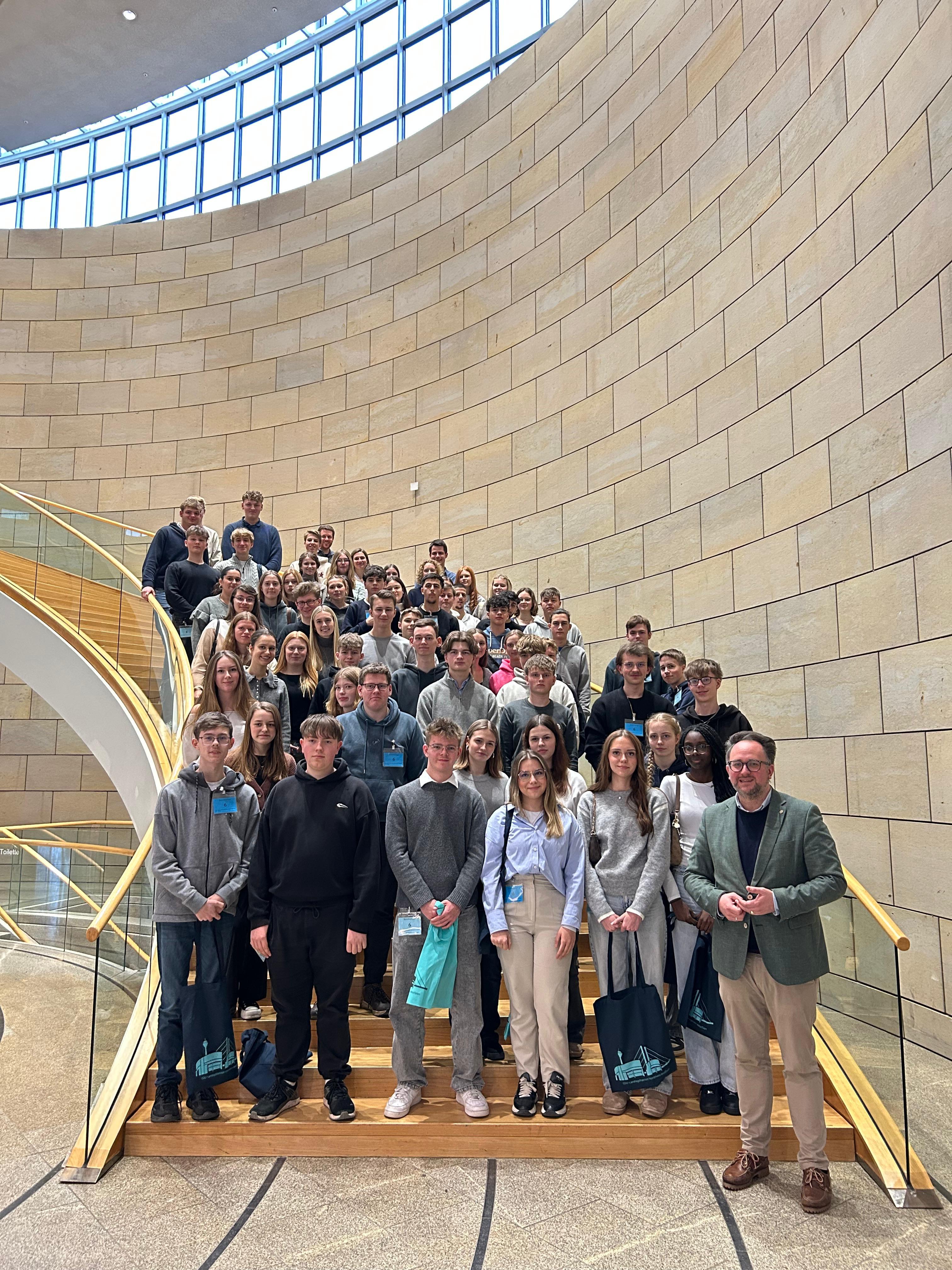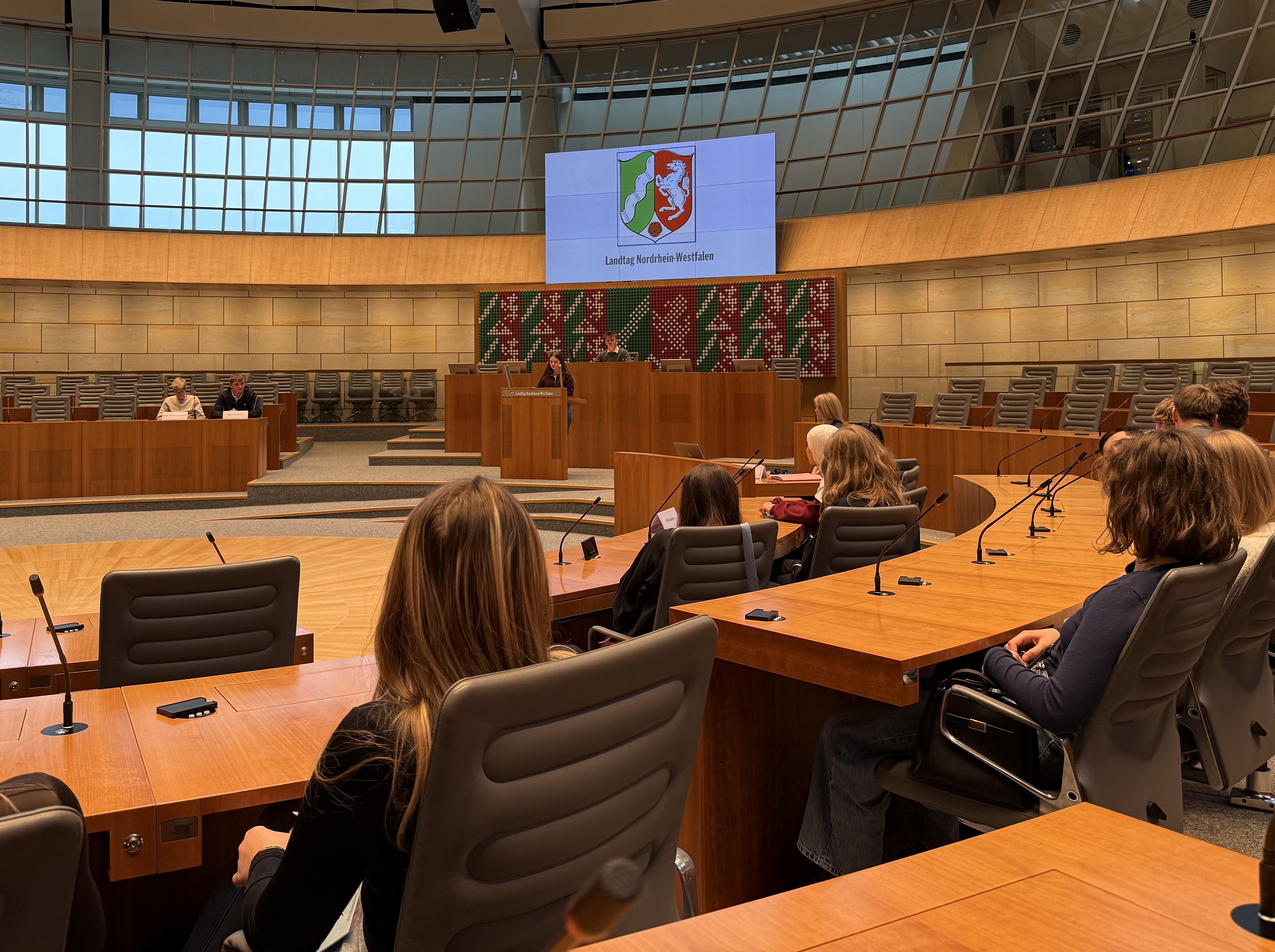 Am 26. Januar 2026 machten sich die sozialwissenschaftlichen Kurse der EF auf den Weg nach Düsseldorf, um den nordrhein‑westfälischen Landtag zu besuchen. Nach der Ankunft mit dem Bus mussten alle Schülerinnen und Schüler zunächst noch durch die Sicherheitskontrolle, aber dann begann auch schon der eigentliche Besuch.