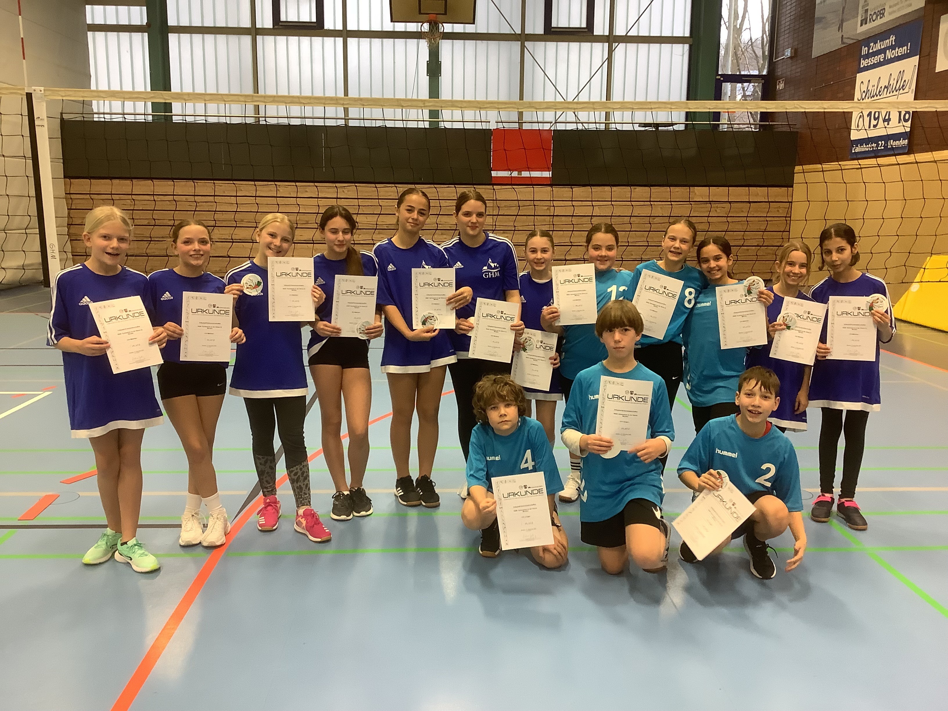 Am letzten Mittwoch vor den Weihnachtsferien richteten die Hönne Volleys vom GHM in der Wettkampfklasse IV das Endturnier im Märkischen Kreis in der Sportart Volleyball sehr erfolgreich aus. Bei den spannenden Endspielen um die Kreismeisterschaft blieben zwei Mädchenteams und ein Mixedteam des Gymnasiums an der Hönne unter sich. Dabei setzte sich die 2. Mädchenmannschaft gegenüber den anderen Teams knapp durch und belohnte sich für die fleißige Trainingsarbeit in der Volleyball-AG mit dem Kreismeistertitel.