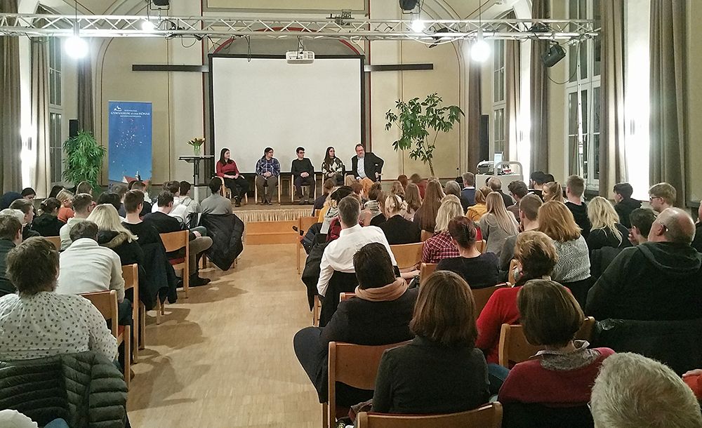 Nachmittags hatte er mit den Mitgliedern der Philosophie-AG im kleinen Kreis angeregt diskutiert, abends stellte er sich in der voll besetzten Aula den Fragen des Moderatoren-Teams (Giuliana Barthel, Selin Baydili, Sortirios Polichronidis, Penka Todorinova) und denen des Publikums, darunter zahlreiche außerschulische Gäste.