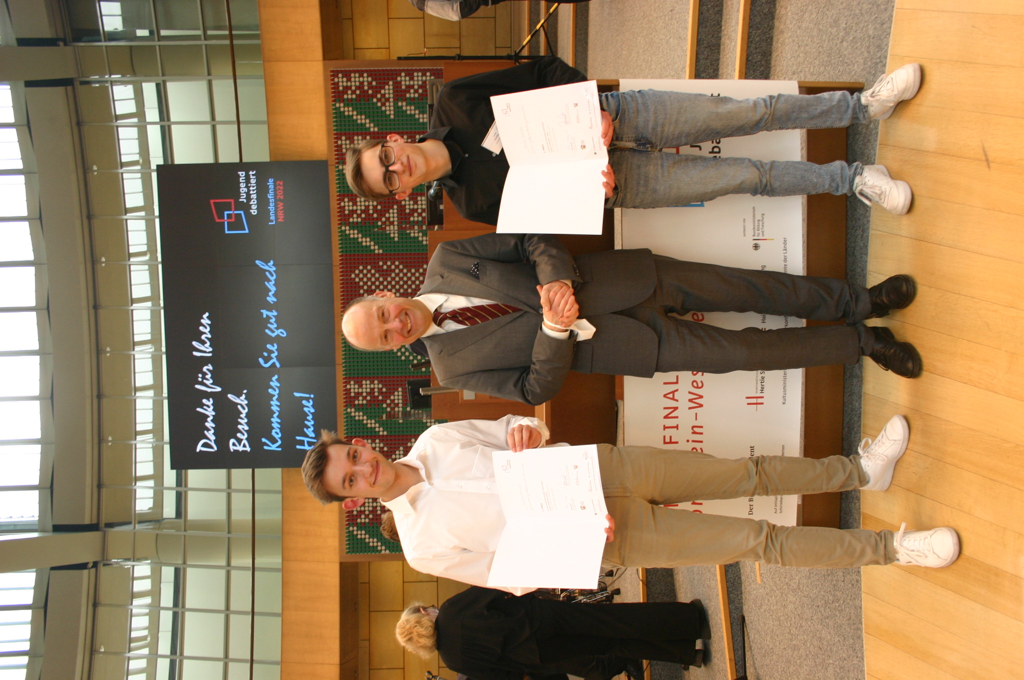 Gewinner dieses Finales, das am 8. April 2022 im Plenarsaal im Landtag Nordrhein-Westfalen in Düsseldorf stattfand, ist der 17-jährige Julius Lachmann, der die 11. Klasse des Gymnasiums an der Hönne in Menden besucht.