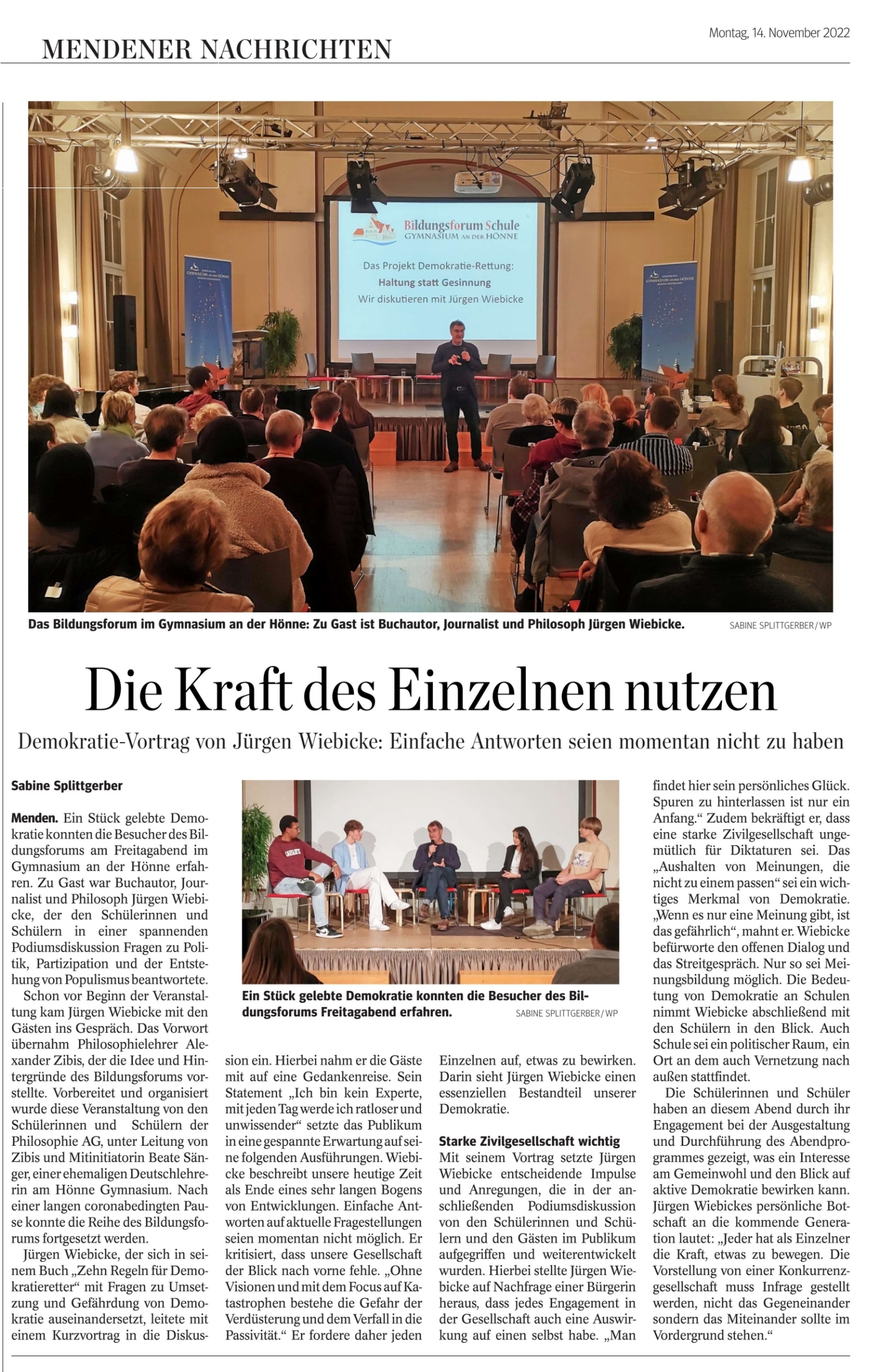 Jürgen Wiebicke, Journalist, Philosoph und Autor u.a. des Buches „10 Regeln für Demokratie-Retter“ war am 11. November 2022 Gast des Bildungsforums Schule am GHM.