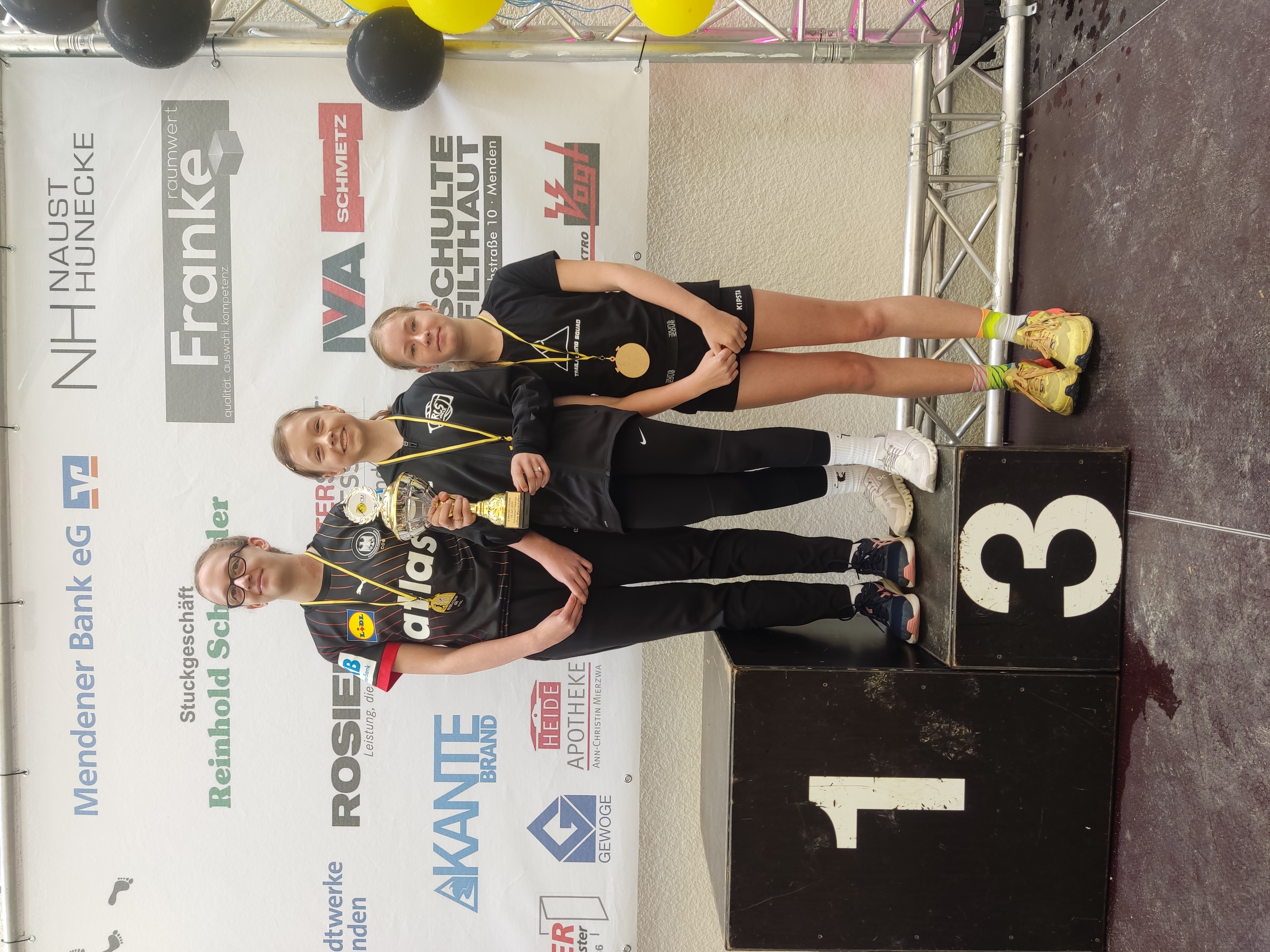 Aus diesen großartigen Einzelergebnissen ergaben sich anschließend auch noch tolle Mannschaftsergebnisse. Bei den Mädchen belegte das GHM die Plätze 1 und 3 und konnte somit zwei weitere Pokale für die Schule gewinnen. Team 1 in der Besetzung Herbst, Heimann und Loschek stand ganz oben auf dem Treppchen, während Team 2 mit Brechlin, Diener und Hammerschmidt rechts daneben Platz nehmen konnte. Auch die Jungen standen in der Besetzung Timmermann, Wöllhardt und Wöllhardt auf Platz 1 der Mannschaftswertung.